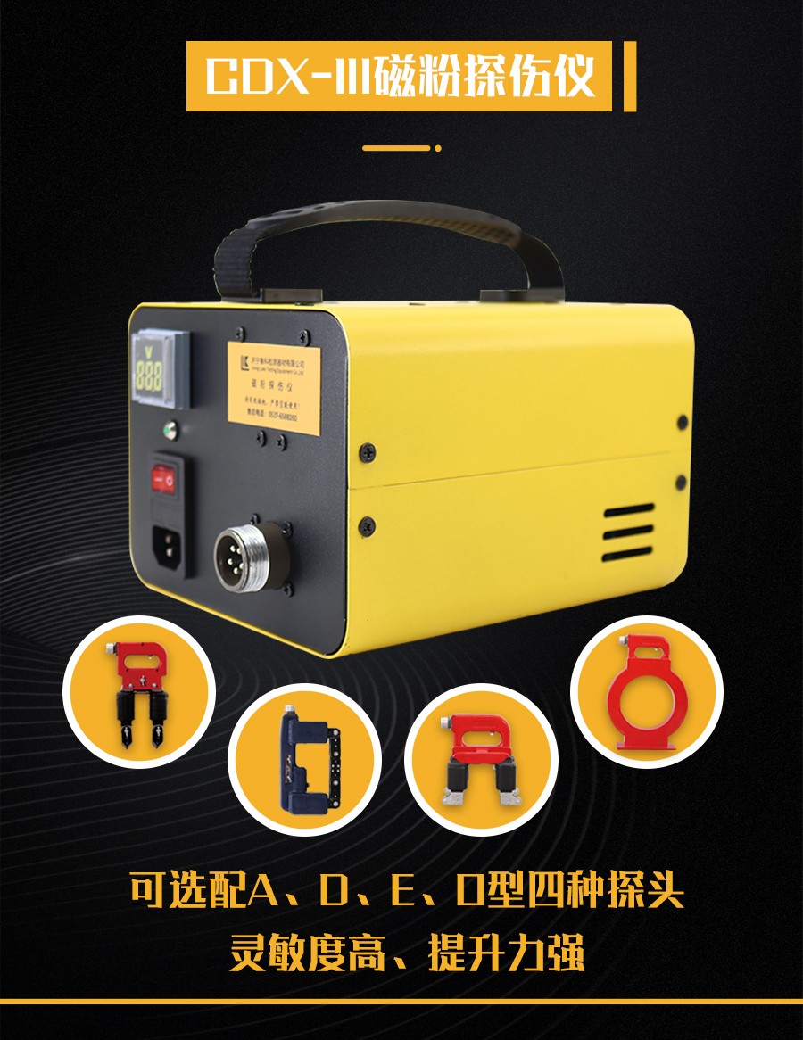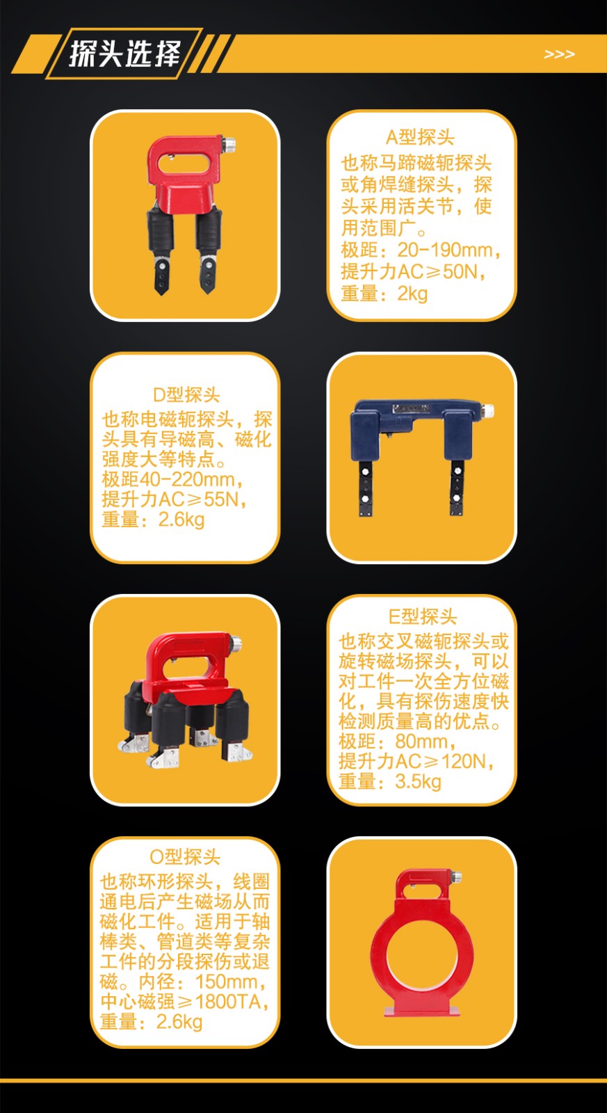 (2)D型探頭:也稱電磁軛探頭,探頭具有導(dǎo)磁高、磁化強度大等特點。極距40mm—220mm,提升力AC≥55N,重量:2.6kg;