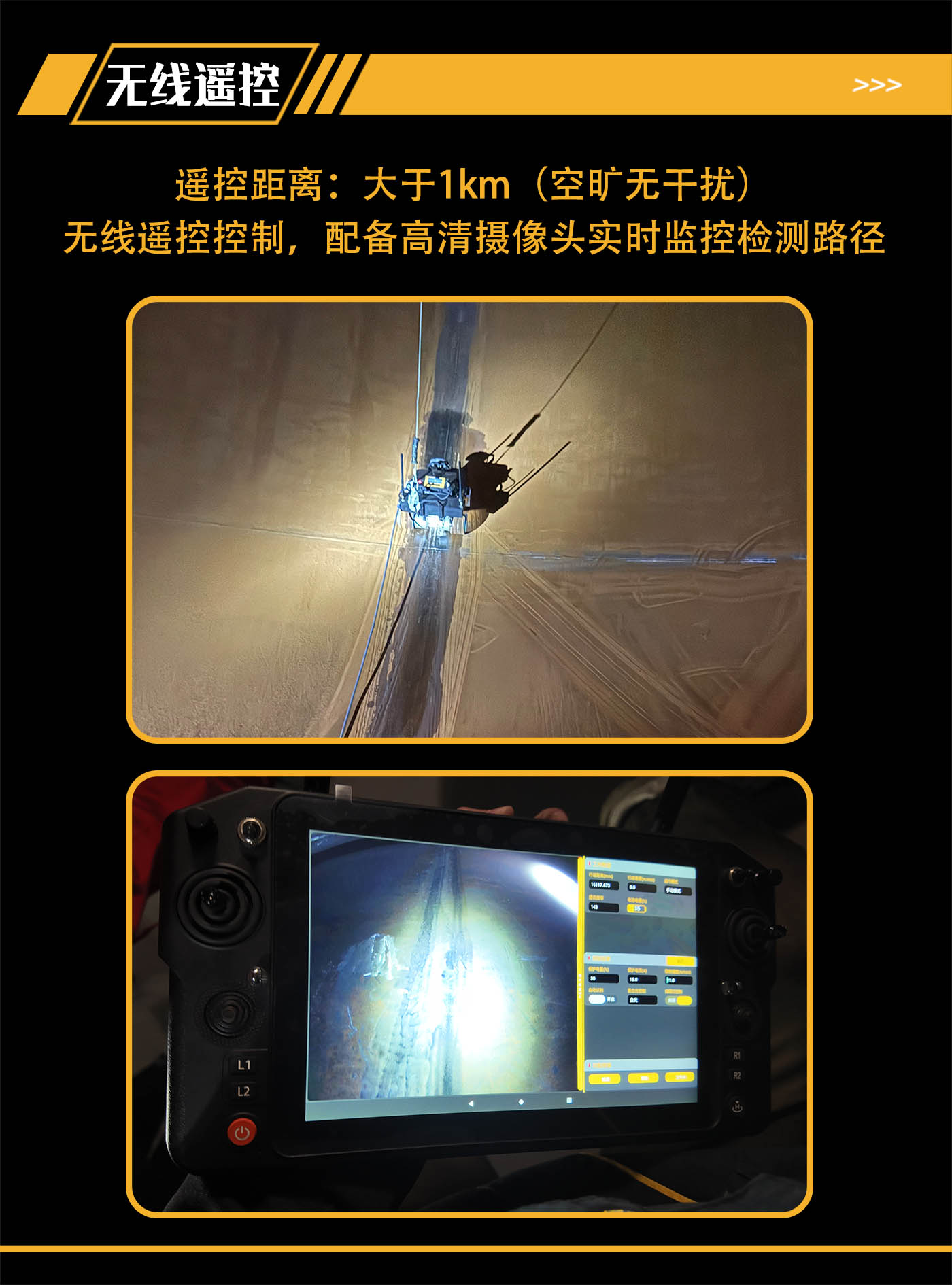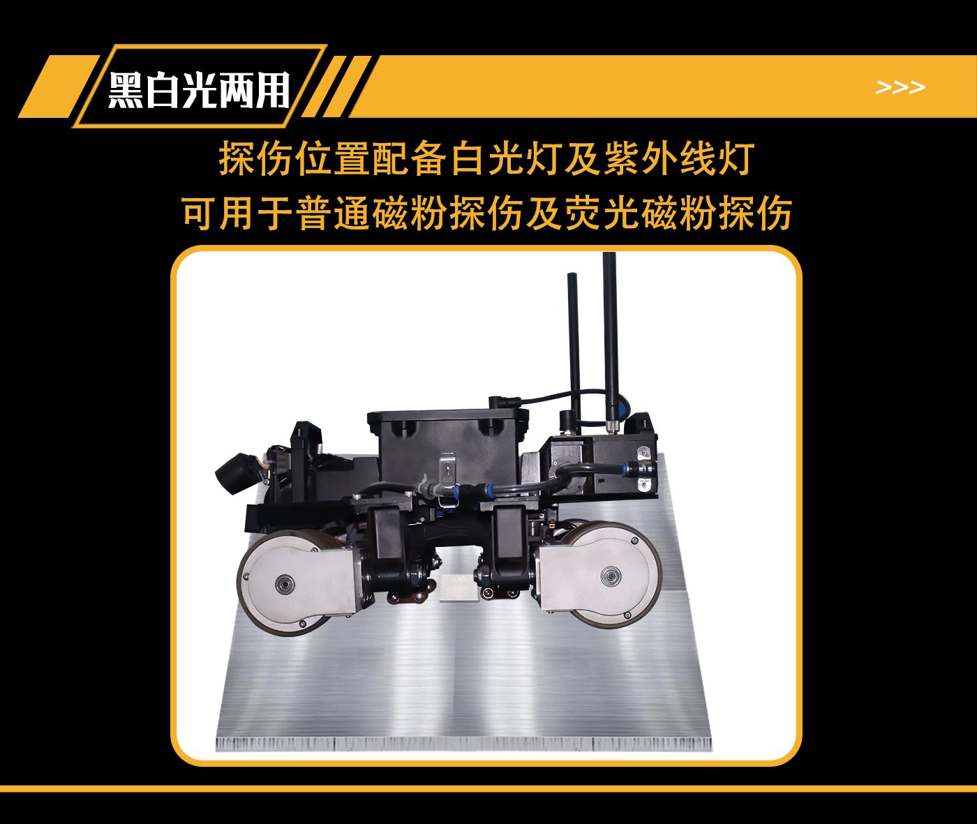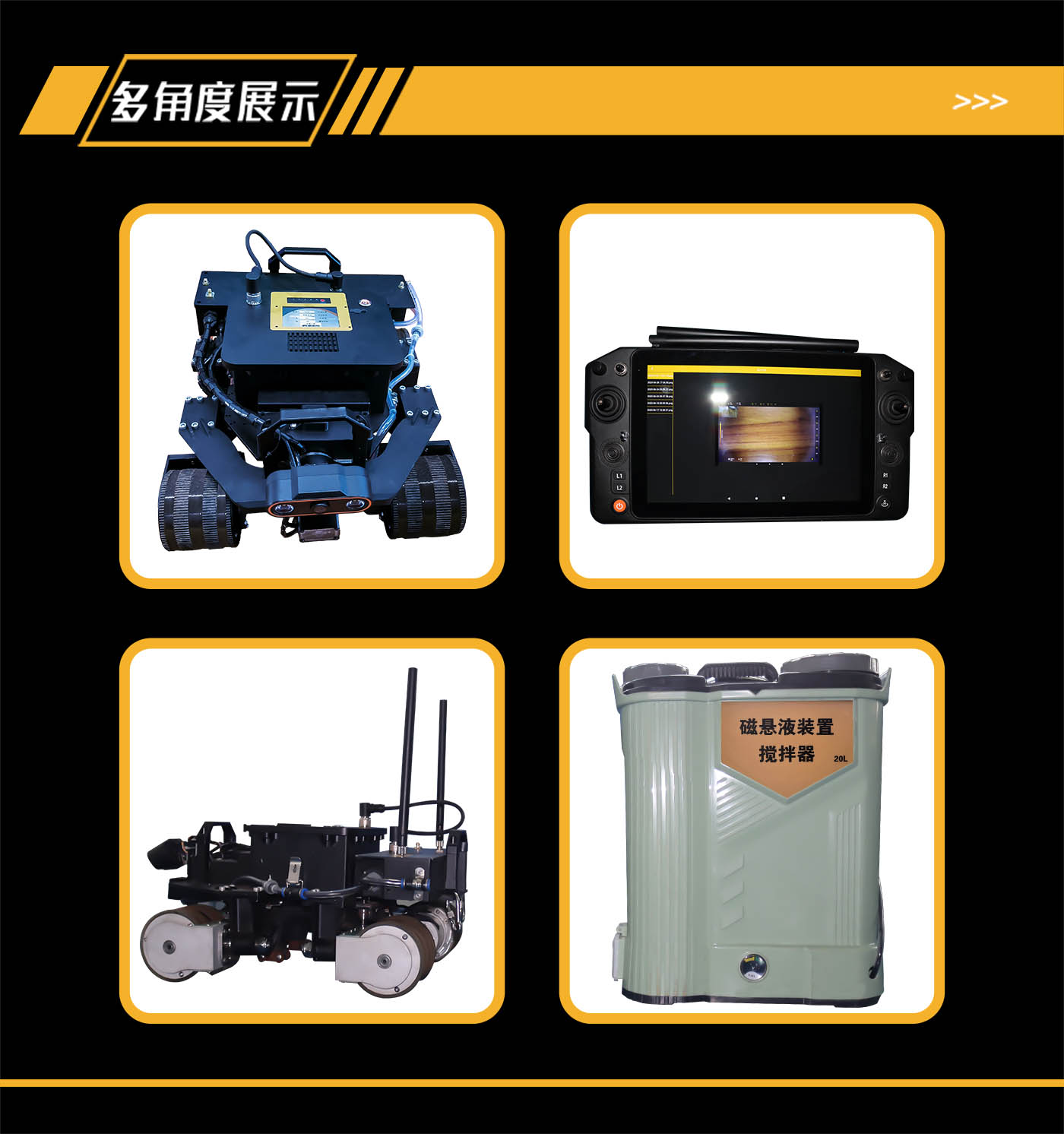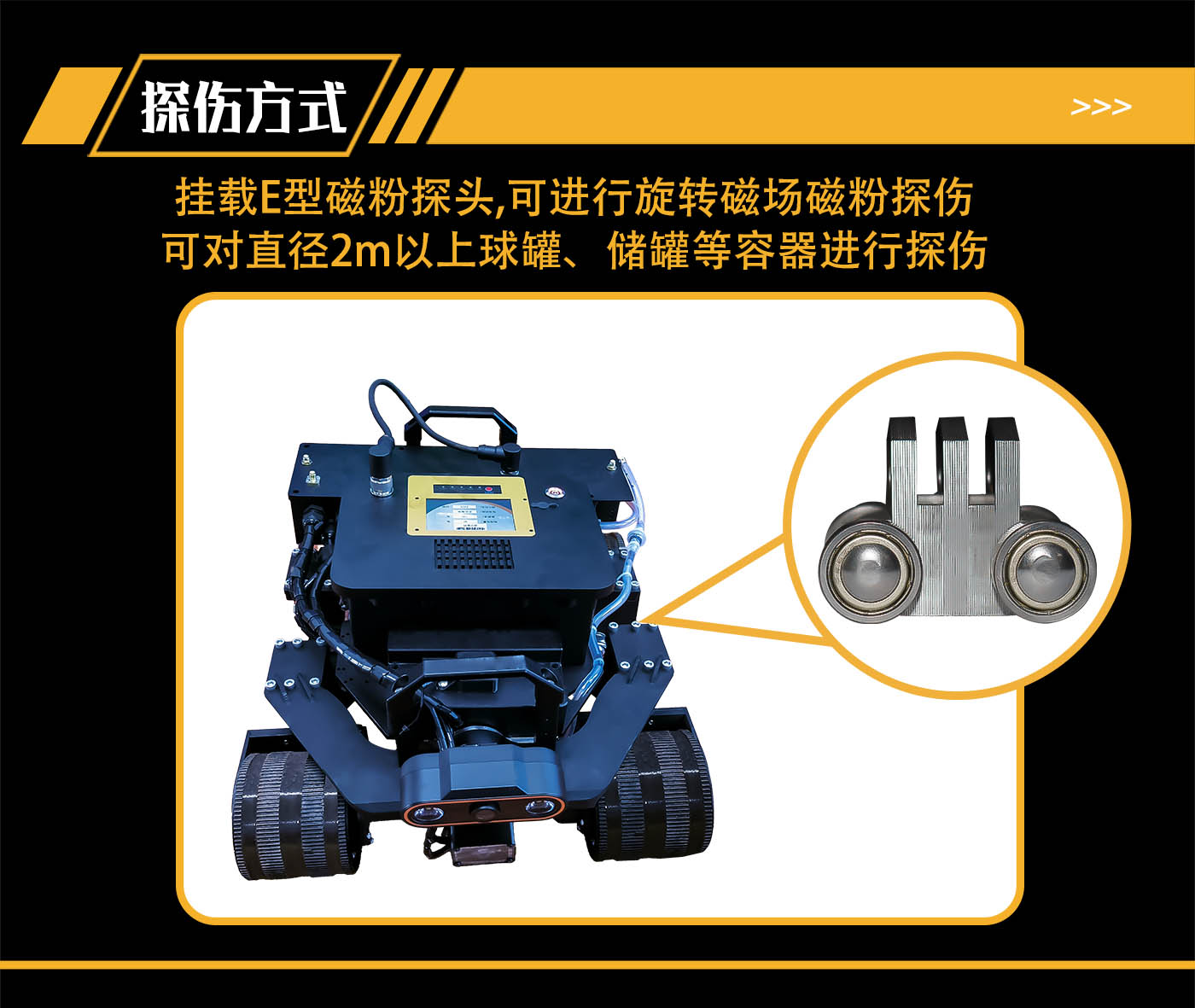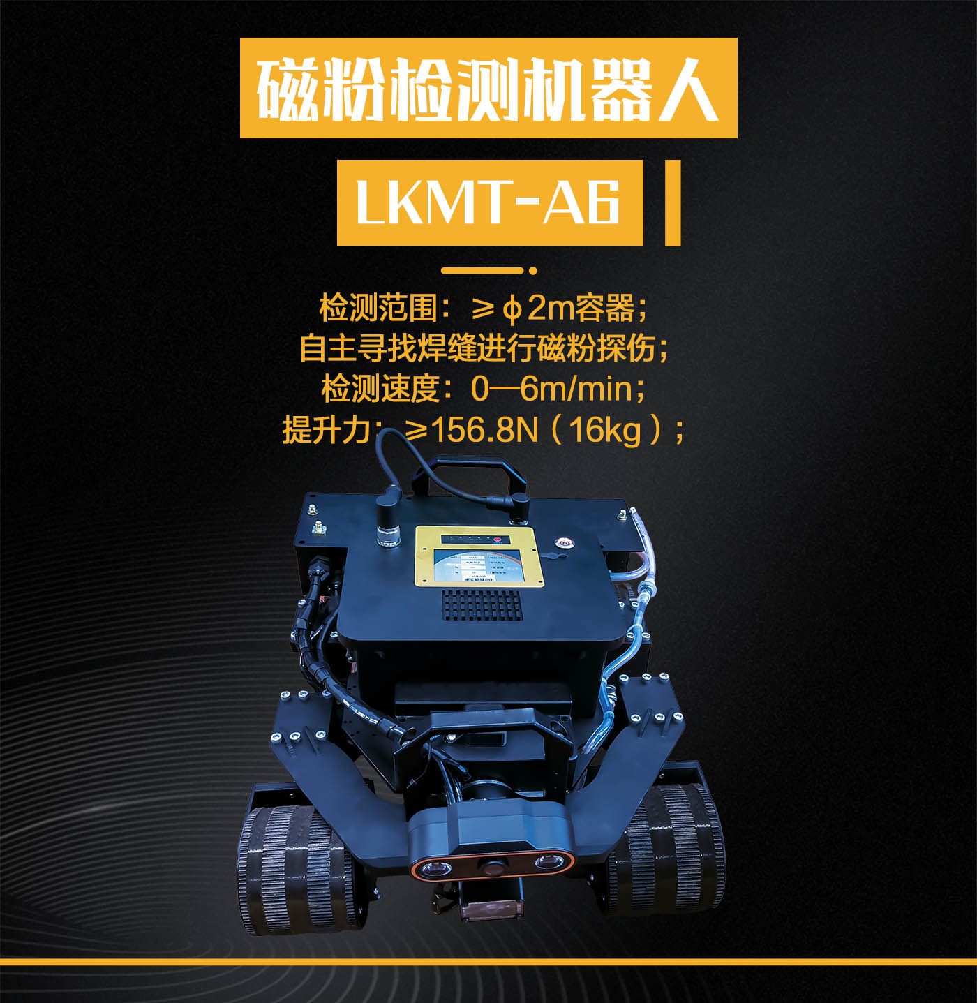 集成無線、有線兩種供電與控制方式控制機器人運動和檢測,遙控器端集成高清彩色屏幕,能夠實時查看檢測區(qū)域及行進方向前側的圖像信息,并且機器人搭載高精度浮動升降平臺,能夠實現(xiàn)檢測過程中磁軛的自適應。適用于大型壓力容器、儲罐等設備磁粉自動化檢測。