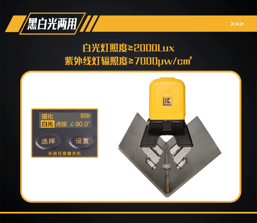 10、磁化電流相位角補償功能;檢測不同夾角度的角焊縫,可在鋰電池電源OLED顯示屏上設置需要探測的工件夾角,解決由于不同的板焊縫夾角會使磁極夾角改變,不能維持在90°的問題。
