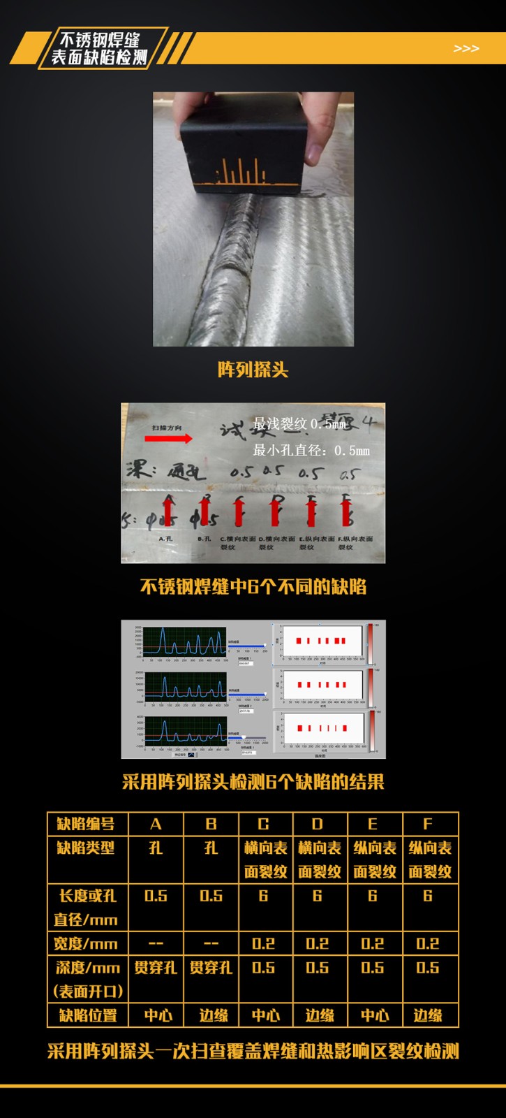 10、檢測(cè)近表面埋深缺陷深度:碳鋼3mm、不銹鋼5mm、鋁10mm;