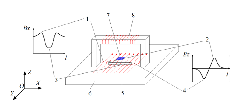 1-電流在裂紋兩端聚集時(shí),Bx出現(xiàn)凸起;2-電流在裂紋尖端順時(shí)針旋轉(zhuǎn)時(shí),Bz出現(xiàn)波峰;3-電流從裂紋底部經(jīng)過(guò)時(shí),Bx出現(xiàn)波谷;4-電流在裂紋尖端逆時(shí)針旋轉(zhuǎn)時(shí),Bz出現(xiàn)波谷;5-缺陷;6-待檢工件;7-傳感器;8-激勵(lì)線圈。