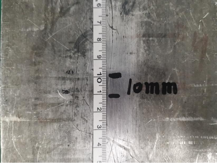 ACFM技術(shù)可以對導(dǎo)電材質(zhì)進行表面及近表面檢測,檢測工件選用了非鐵磁性材質(zhì)(鋁材質(zhì)工件),工件表面刻有10mm長度刻槽,檢測工件如圖3所示,由于本次實驗是做長度測試,因此探頭掃查方向與缺陷方向平行,即感應(yīng)電流與缺陷方向垂直,此方向檢測效果最好并能準確的獲得缺陷實際長度。
