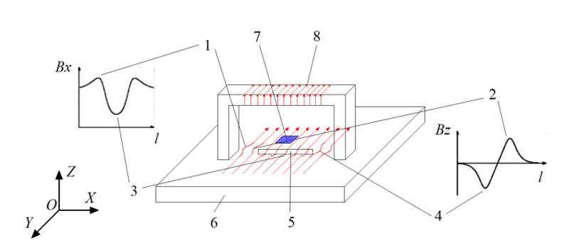 1-電流在裂紋兩端聚集時,Bx出現(xiàn)凸起;2-電流在裂紋尖端順時針旋轉時,Bz出現(xiàn)波峰;3-電流從裂紋底部終過時,Bx出現(xiàn)波谷;4-電流在裂紋尖端逆時針旋轉時,Bz出現(xiàn)波谷;5-缺陷;6-待檢工件;7-傳感器;8-激勵線圈。