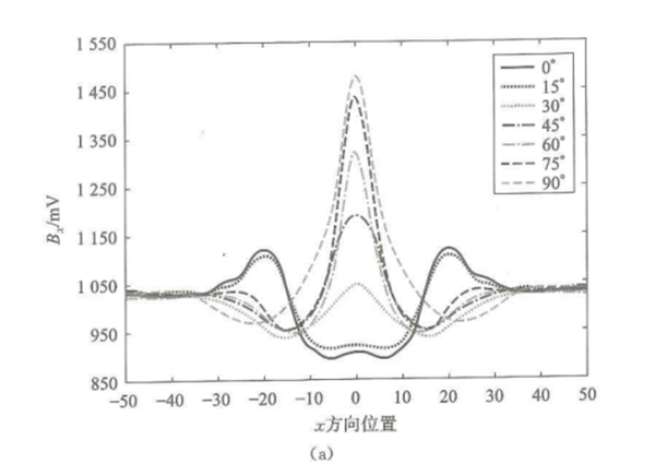 ACFM原理中,當裂紋的走向與探頭的掃查方向平行時,ACFM檢測系統(tǒng)的檢測靈敏度最高,但在實際檢測中,裂紋的走向未知。因此,對于不同走向的裂紋,ACFM的信號應具有不同的響應,如圖5-7所示。