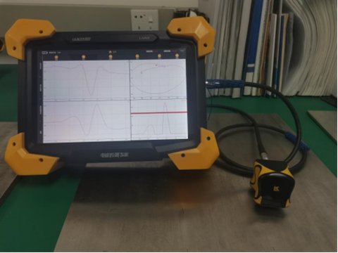 檢測(cè)設(shè)備采用國(guó)產(chǎn)LKACFMX2型交流電磁場(chǎng)檢測(cè)儀,ACFM檢測(cè)儀如圖2左所示,檢測(cè)探頭為常規(guī)標(biāo)準(zhǔn)探頭,如圖2右所示,由雷莫線與儀器相連。